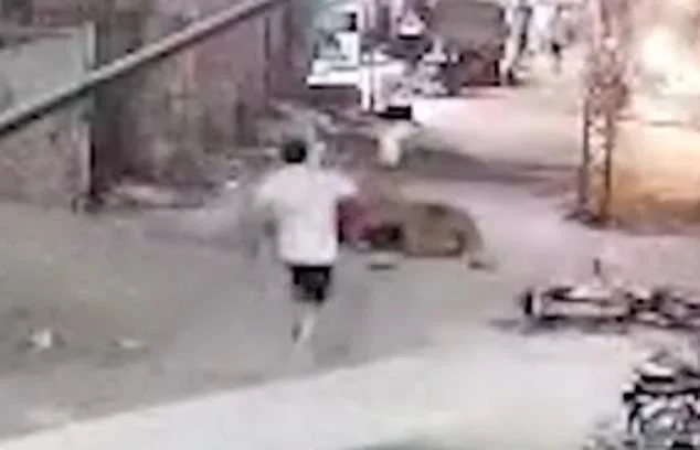 The video shows a lion jumping over a wall and then attacking victims in a residential area. The woman and her two children notice the danger, but moments later the beast jumps on her back and knocks her to the ground. A passerby rushes to her aid, trying to scare the predator away.