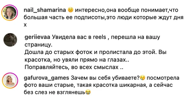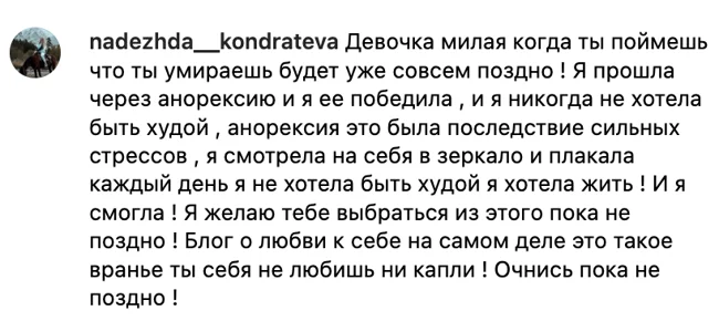 The thing is that Alina has problems with eating disorders, anorexia. In her posts, she openly talks about her struggle, mentioning that this disease is not only physical, but also psychological. Alina uses her platforms to draw attention to this issue by sharing her personal experiences, emotional difficulties, and attempts to overcome anorexia.
