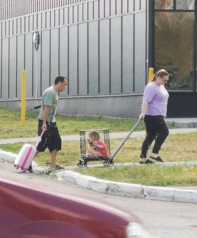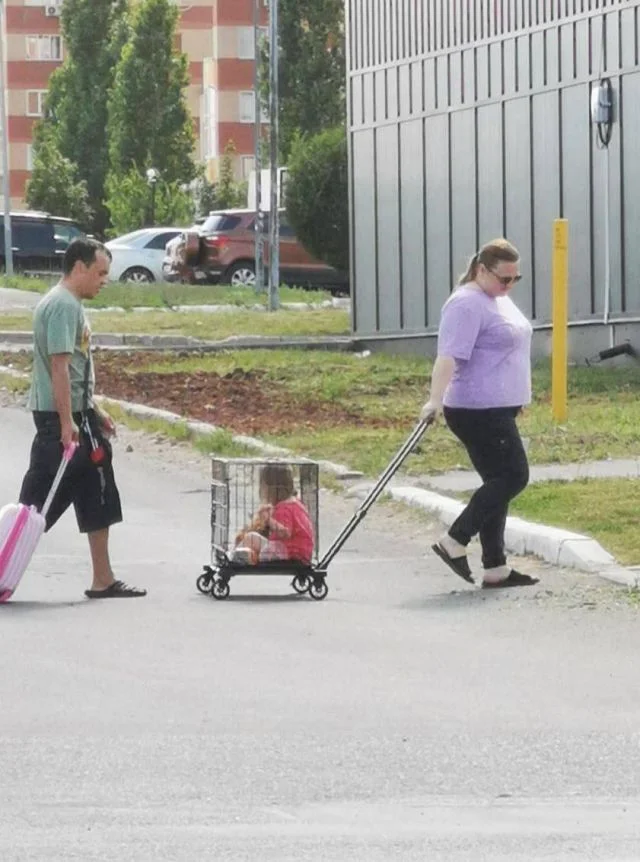 In Russia, parents of the year were noticed who were transporting a child in a cage on wheels (2 photos + video)