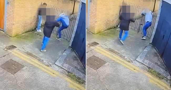 The footage shows a man pointing a whip at the fugitives hiding in the corner of an alley.