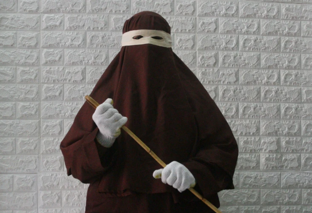 All female executioners wear a thick jilbab (one of the types of body coverings among Muslims, practically the densest, hiding almost everything) and cover their faces from the crowd.