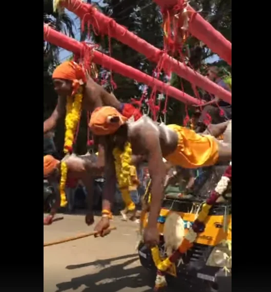 And so, to appease Kali and allow her to quench her thirst, every year the locals pretend to be Gaudans. They also offer her their blood. And how do you become like a human eagle? By hanging yourself high on a hook, and to draw blood, the hook is pierced right through your skin. And they hang like eagles, several at a time, from an artificial tree.