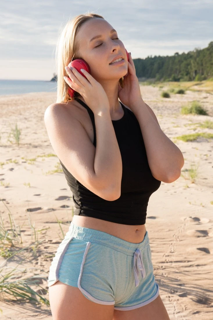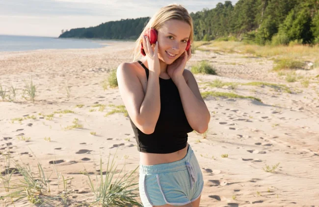 Стройная блондинка Агата отдыхает на песчаном берегу. Красивая девушка с большой натуральной грудью и открытой улыбкой.