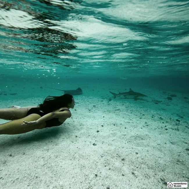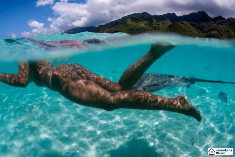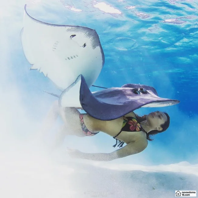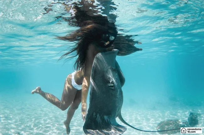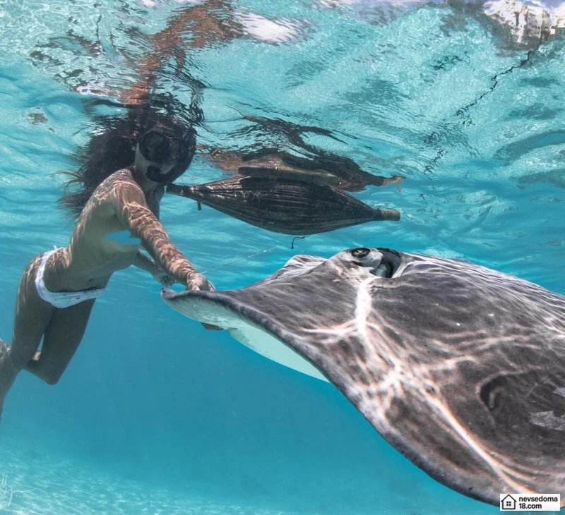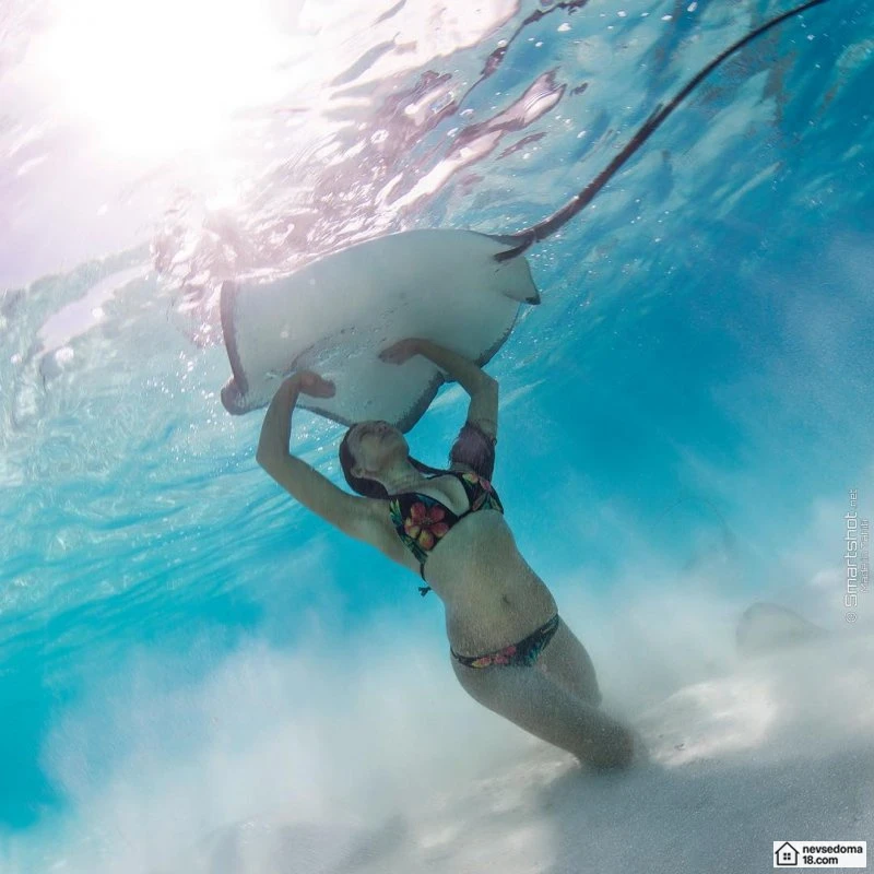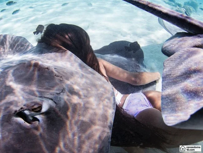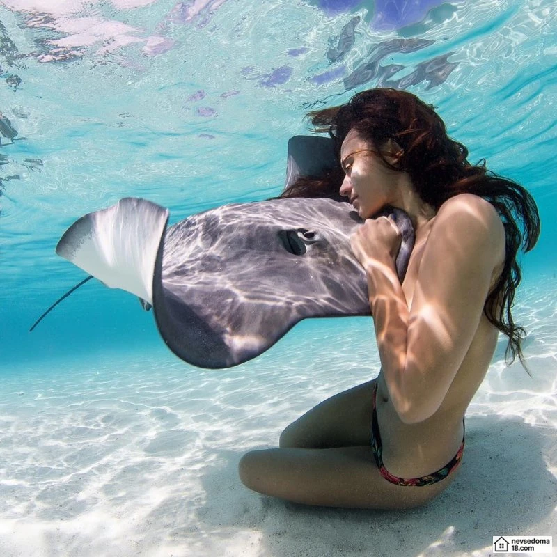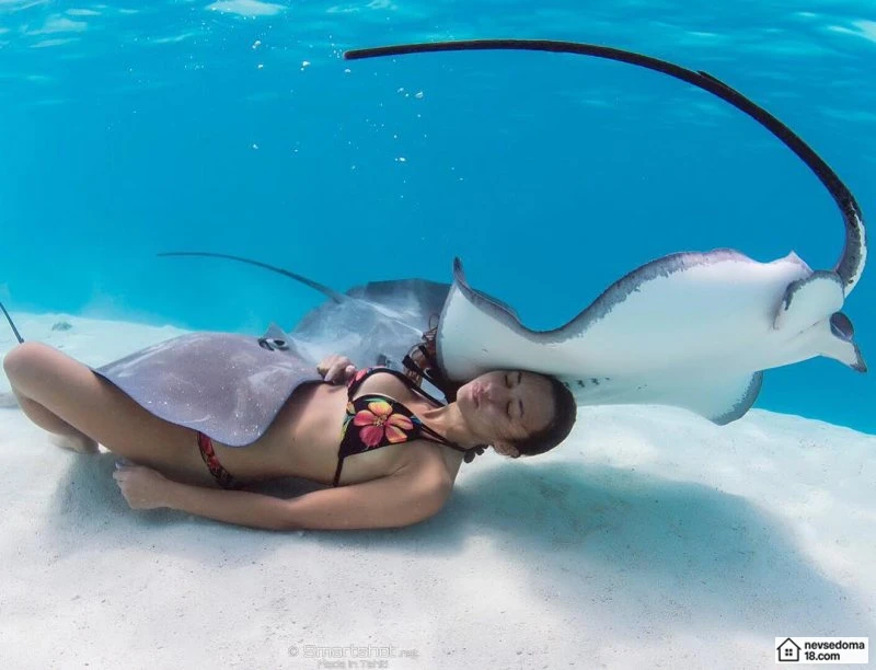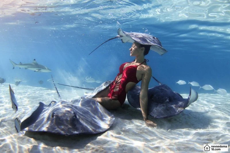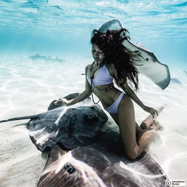 Рава Рэй из Таити показана в красивой подводной фотосессии с опасными существами. Но, похоже это её не беспокоит . Она сказала, что не испытывает страха когда ныряет среди акул, черепах, скатов, китов и дельфинов и что она научилась «делиться» с ними водой.