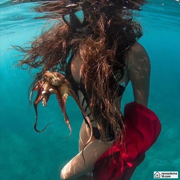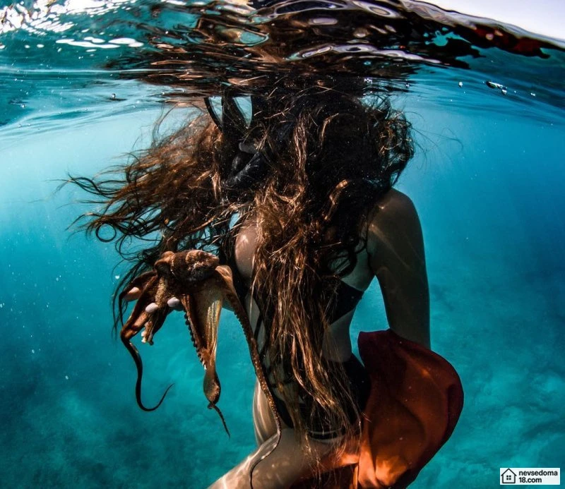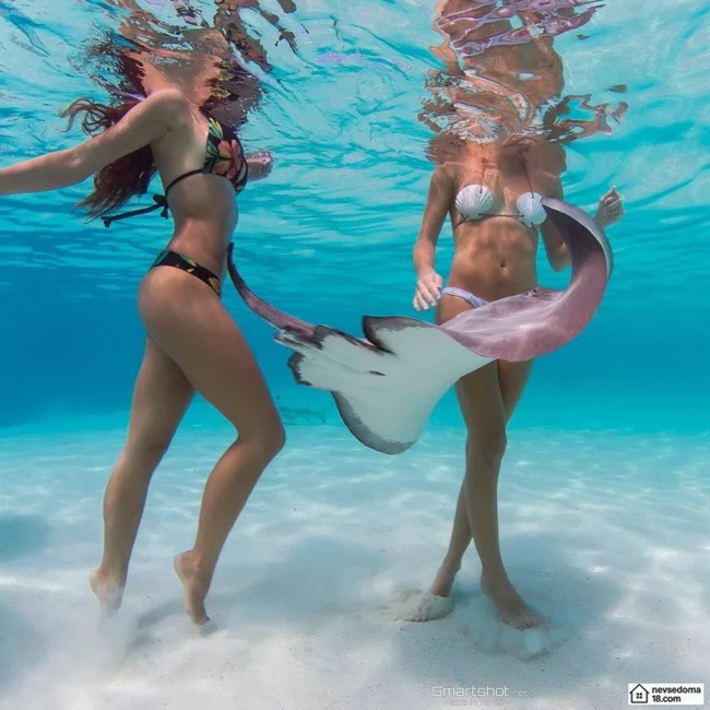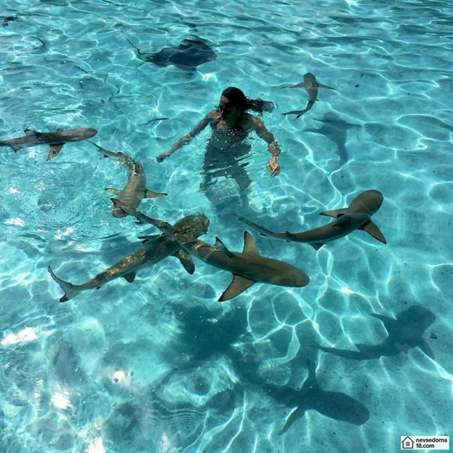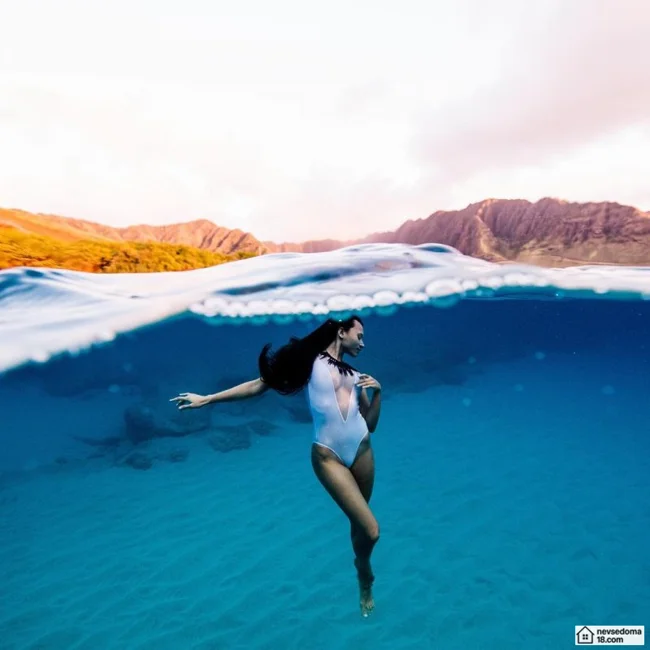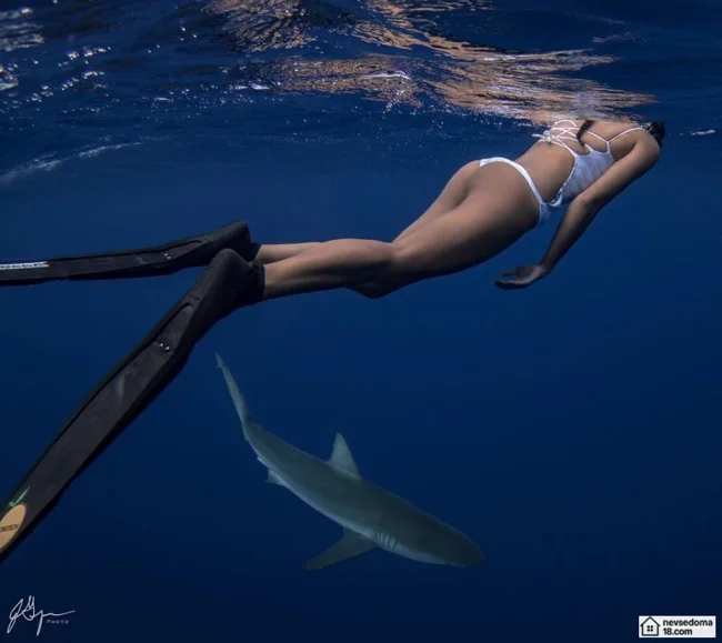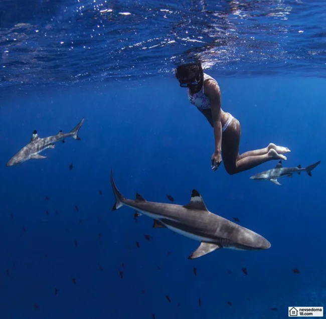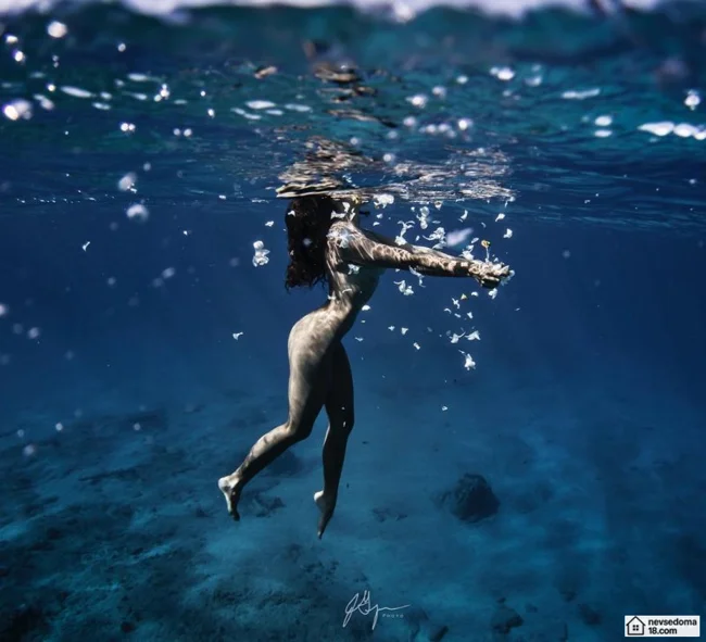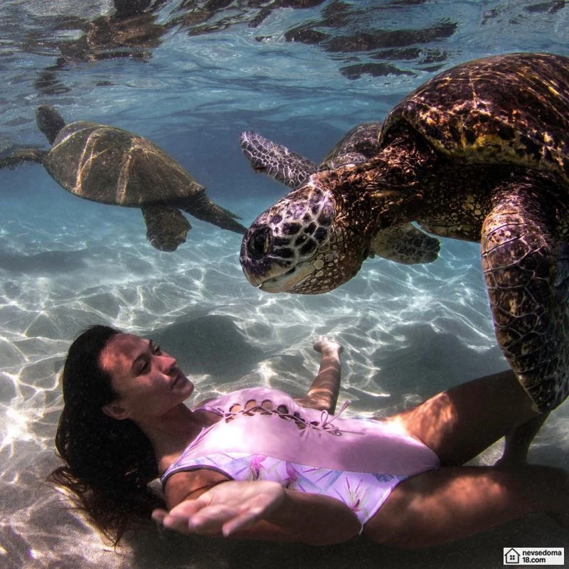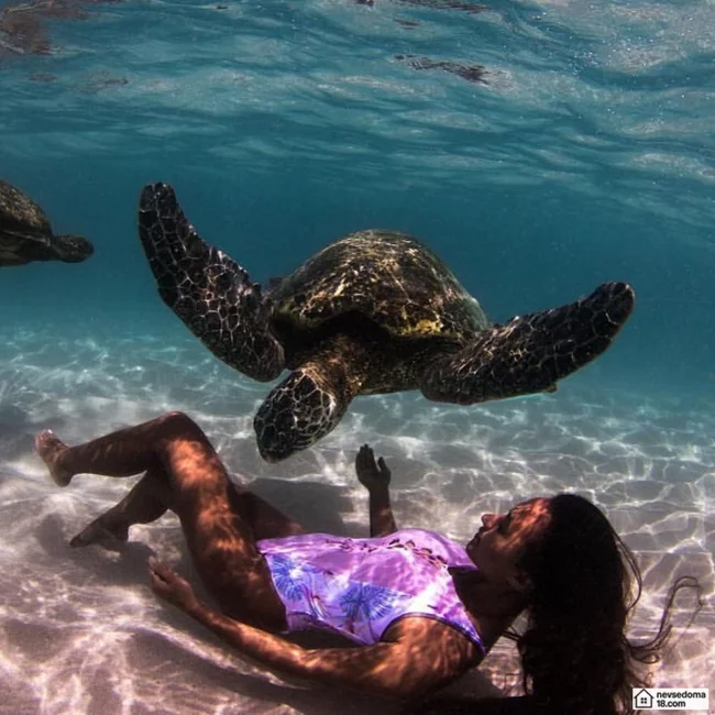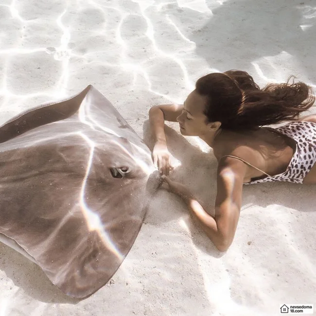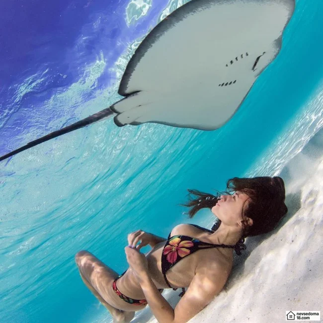 Рава Рэй из Таити показана в красивой подводной фотосессии с опасными существами. Но, похоже это её не беспокоит . Она сказала, что не испытывает страха когда ныряет среди акул, черепах, скатов, китов и дельфинов и что она научилась «делиться» с ними водой.