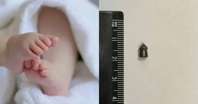 Якось майбутній тато тренувався на задньому дворі та стріляв по мішенях із пневматичної зброї. Несподівано він схибив і випадково потрапив вагітній дружині прямо в живіт. УЗД показало, що куля застрягла у плода в животі, але знаходилася у дитини під шкірою та особливих страждань, не завдавала.