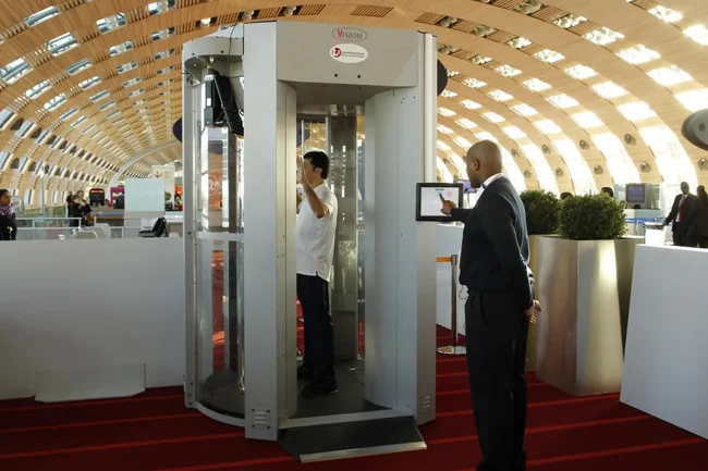Він виглядає як прозора кабінка, в якій навколо тіла людини одноразово проїжджають по колу дві антени, що випромінюють хвилі міліметрового діапазону, для яких одяг та інші подібні матеріали прозорі.