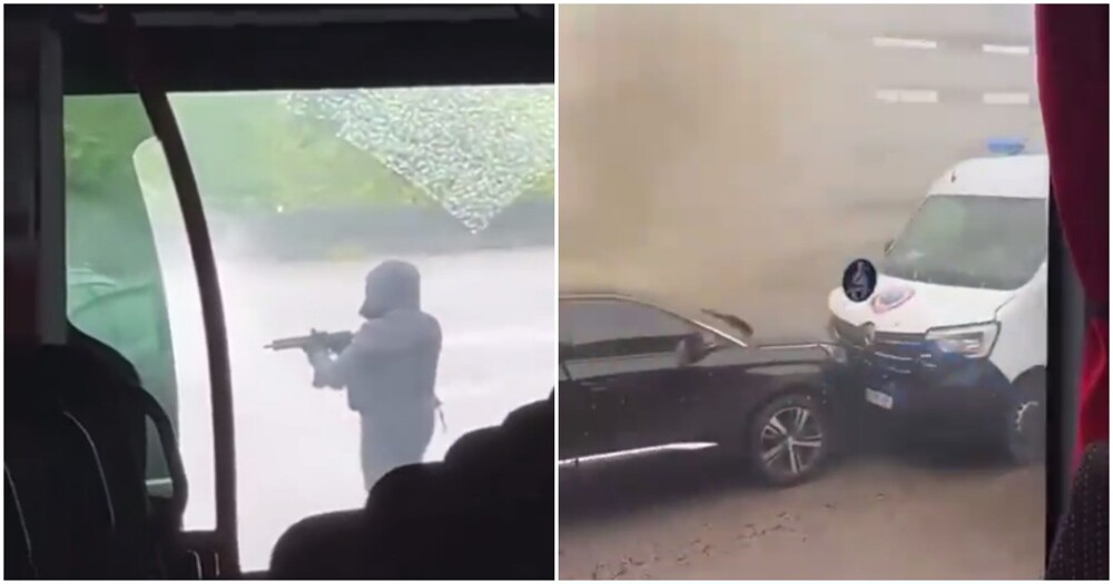 На кадрах, знятих пасажиром автобуса, можна побачити одного з нападників і тюремний фургон, заблокований автомобілем, що горить.