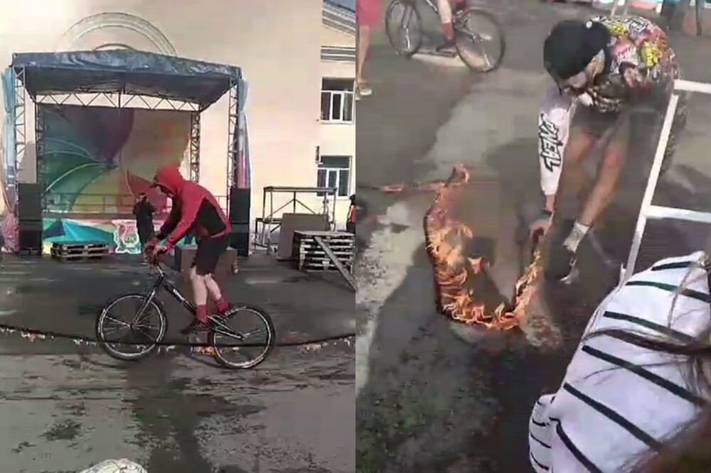 За задумом, через підпалений канат мав стрибати велосипедист, але щось пішло не так.