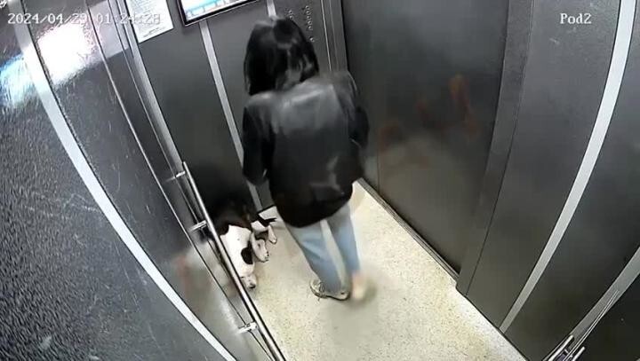 На кадрах видно, як жінка заходить у ліфт разом із собакою та починає бити її ногами та руками. Після того, як двері ліфта відчиняються зловмисниця швидко виходить з ліфта. Пес на деякий час залишається на самоті, але потім жінка повертається до нього, вистачає чотирилапого вихованця за передні лапи і тягне до під'їзду.