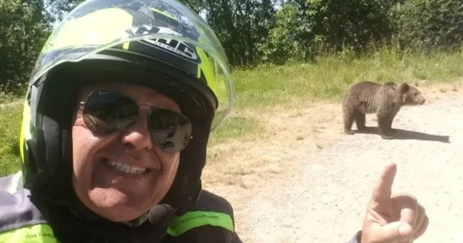 Мандрівник також опублікував селфі, на якому посміхається і вказує на ведмежатку на узбіччі дороги.