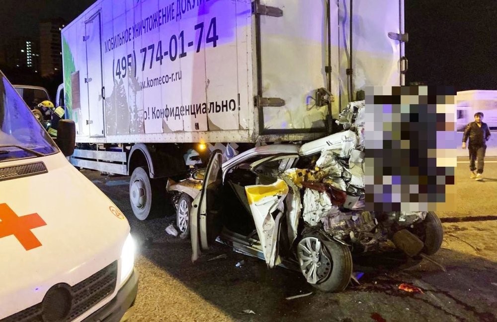 Авария произошла 12 мая ночью на 69 километре МКАД. Сперва столкнулись такси и грузовой автомобиль. Через какое-то время в легковой автомобиль въехал фургон и буквально впечатал легковушку в грузовик.