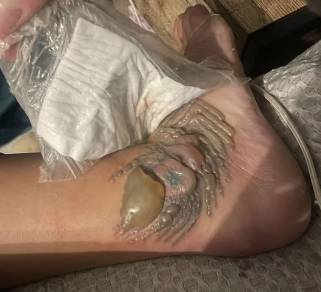 Самый крупный волдырь на лодыжке достигал 6,5 см в ширину. Отек был настолько сильным, что женщина несколько недель не могла носить обувь, а боль мешала нормально спать и передвигаться.