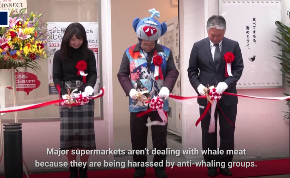 Мэр в шапочке КИТА открывает торжественно автомат по продаже китовьего мяса