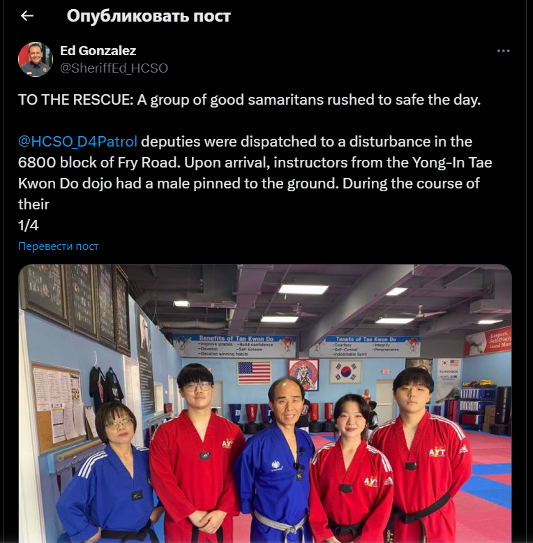 Департамент шерифа округа Харрис считает, что Ан и его семья спасли молодую женщину от сексуального насилия. “Используя свою подготовку и дисциплину, им удалось остановить нападение и задержать его”, - сказал шериф Эд Гонсалес в серии постов на X.