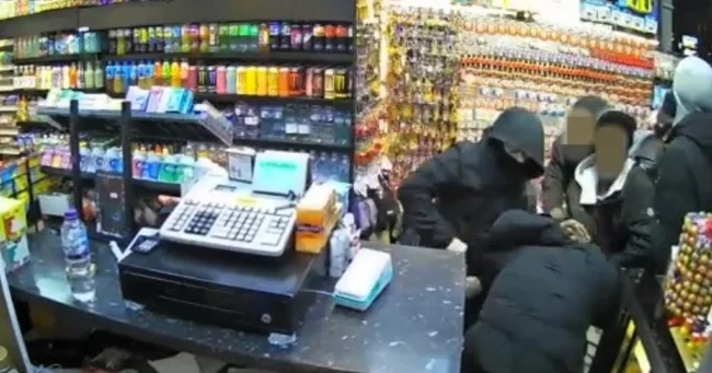 На кадрах первого ограбления подростки в спешке заходят в магазин. Самый высокий из них приближается к прилавку, где хранятся вейпы, и говорит продавцу, что хочет просто «посмотреть». Ситуация обостряется, когда появляется ещё один молодой человек. Банда начинает избивать работника, а когда он оказывается на полу, хватает коробку и убегает.