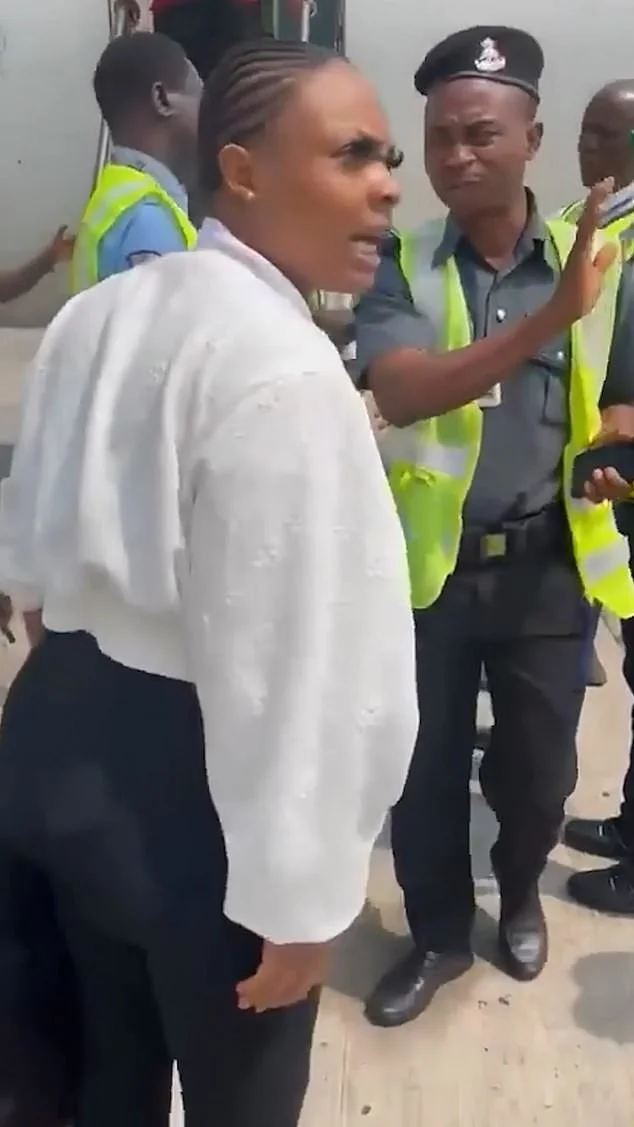 Когда поднялся шум, пилот отказался продолжать рейс и вернулся в терминал международного аэропорта Мурталы Мухаммеда. Пассажирку выпроводили из салона, но уже в дверях она дала пощёчину стюардессе.