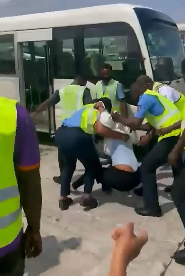 Женщина надевает куртку, и её вместе с багажом выводят из самолёта. У трапа её встречают наземный персонал и охрана, начинается потасовка.