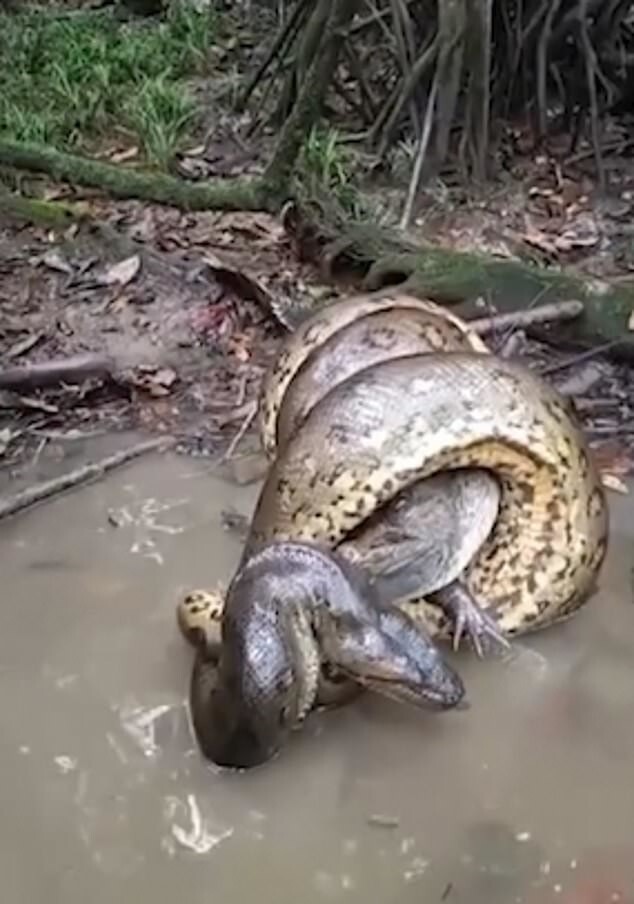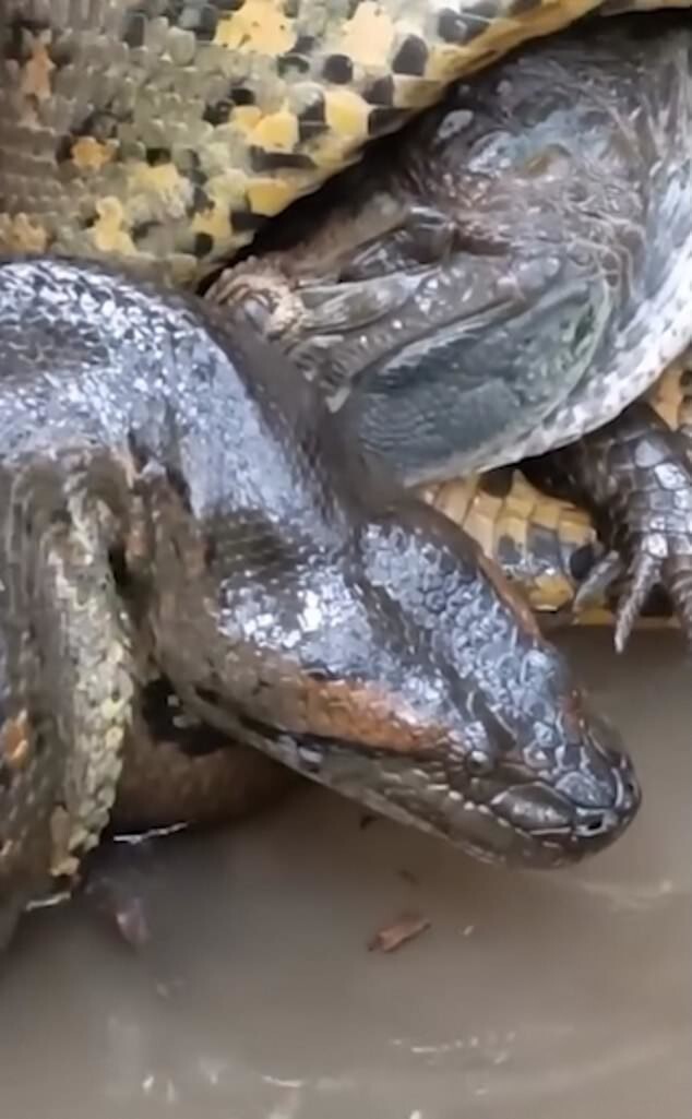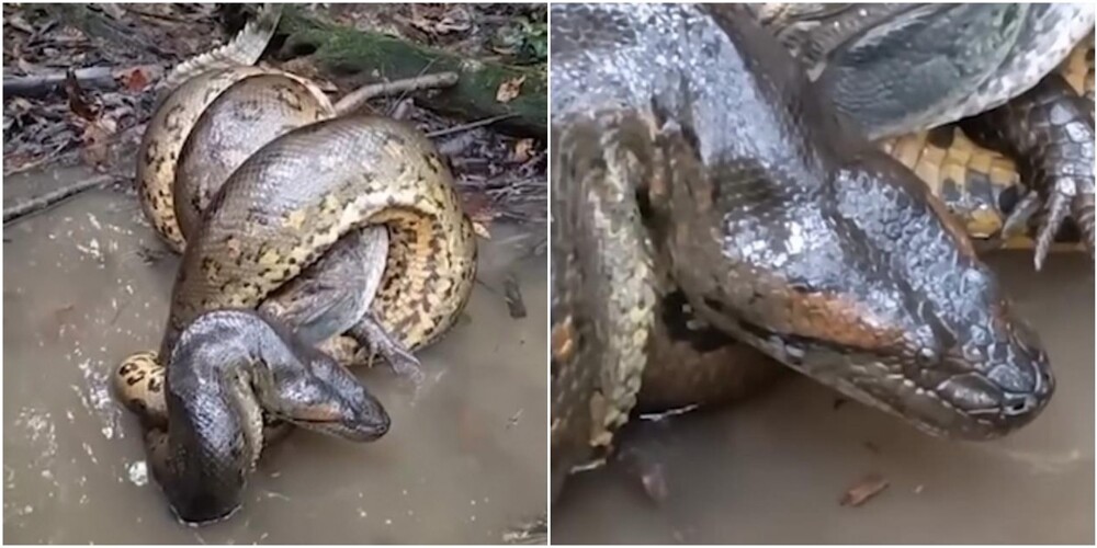 Туристы засняли в тропических лесах Амазонии, Бразилия, пугающую сцену. Огромная анаконда зажала в своих знаменитых "смертельных объятиях" каймана — маленького крокодила. На кадрах видно, как бедняга-кайман бьёт хвостом, пытаясь вырваться из неумолимой хватки, но все его попытки вырваться тщетны. Змея в это время выглядит невозмутимо, и угрожающе смотрит на автора видео.