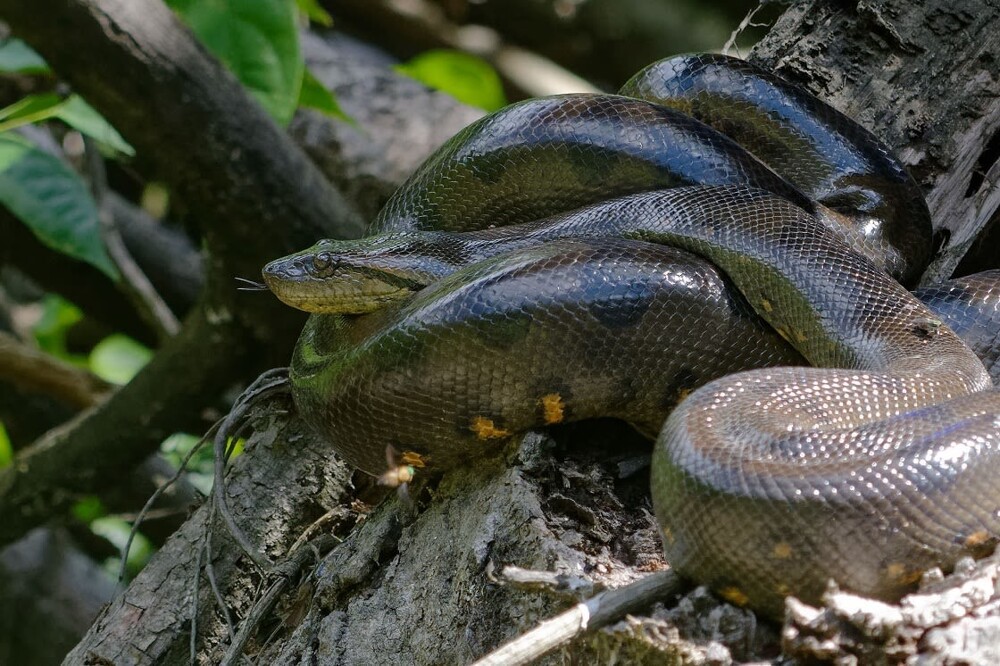 Анаконда — самая массивная змея в мире. Их длина может достигать целых 5 метров. Она не ядовита, и убивает своих жертв "объятиями" и последующим сдавливанием, от которого животному практически нереально вырваться на свободу. А кайманы — это маленькие крокодилы. Все виды кайманов достигают длины всего в 1.5-2 метра, и весят примерно от 6 до 40 кг.