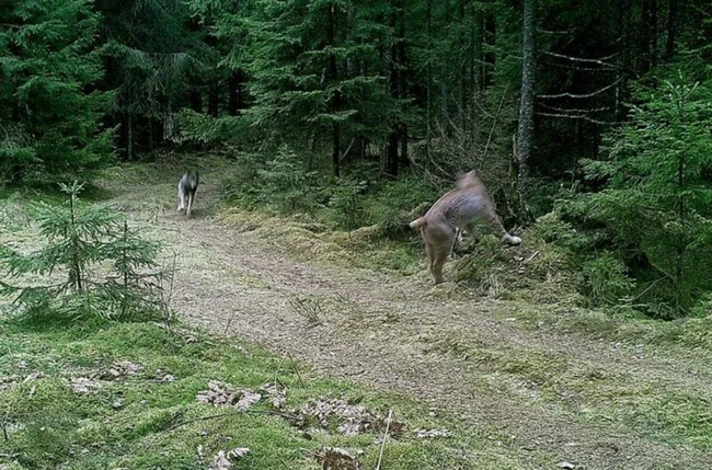8 секунд смертельной битвы: фотоловушка засняла схватку волка и рыси (7 фото)