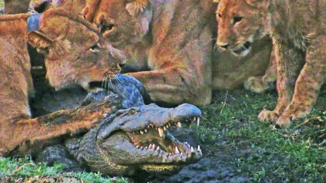 Одна из львиц обездвижила рептилию, схватив ее зубами. Затем она попыталась вытащить ее из канавы, но та извернулась и попыталась укусить ее в ответ. Тут вмешались другие львы и прижали крокодила лапами к земле.