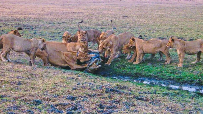 Необычная львиная охота попала на видео в старейшем и самом большом национальном парке страны Kafue National Park, располагающемся на равнинах Бусанги. На видео дюжина львов окружила огромного крокодила и напала на него.